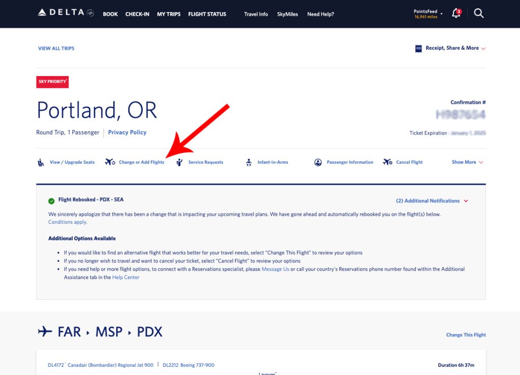 If your trip has a schedule change, your trip will look like the screenshot below. Notice that it says your flight has been rebooked and offers options to change or cancel.