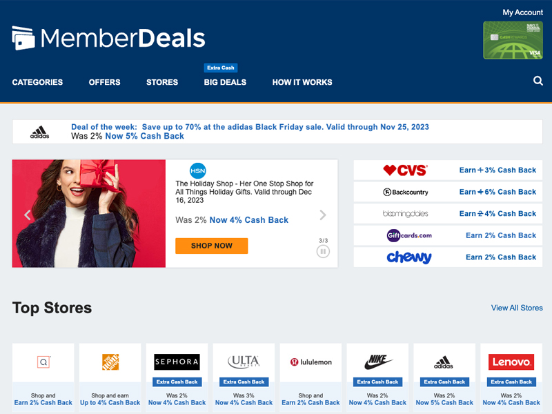 - Review available cash-back offers by browsing the Member Deals portal. There are over 1,200 different merchants.