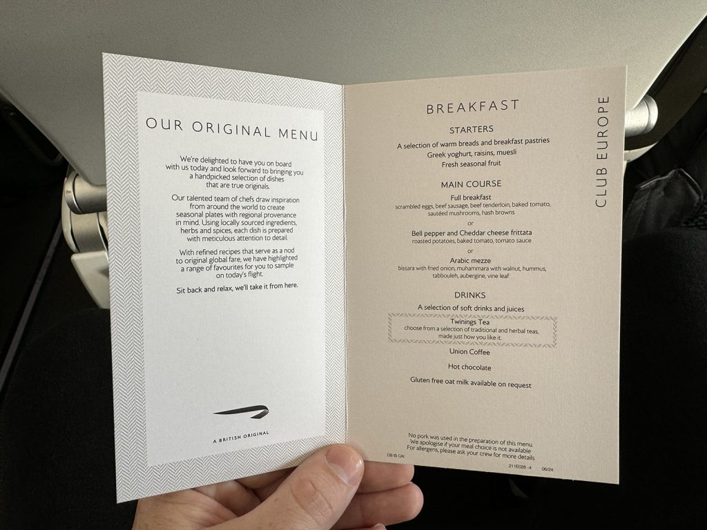 I wasn’t expecting much from British Airways, but I was pleasantly surprised at the breakfast menu for my flight. They offered three main courses — a full breakfast, bell pepper, and cheese frittata, or Arabic mezze.