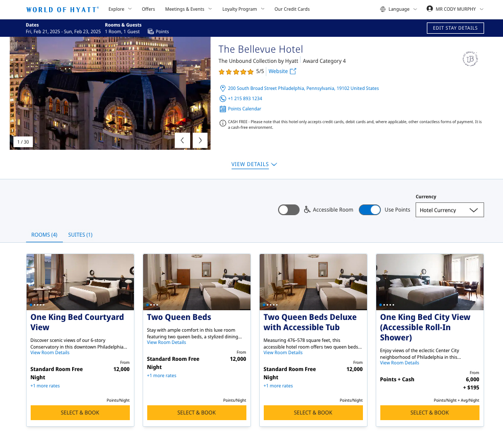The Bellevue Hotel is an iconic downtown Philadelphia hotel that recently underwent a transformative renovation. The hotel is part of The Unbound Collection by Hyatt and a Category 4 hotel, which means you can redeem World of Hyatt points and free night certificates here.